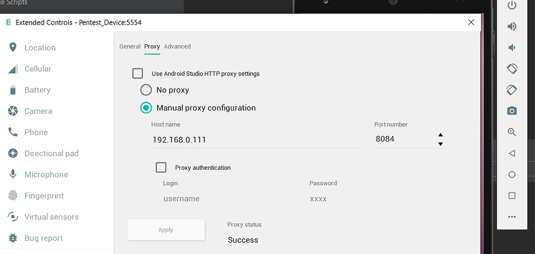 4. If you are using an emulator like Android Studio, start your Emulator and click on the three dots on the side of the emulator to open settings and click on Settings > Proxy, Select Manual proxy configuration. In the Hostname add your IPv4 and in the Port number add the port.