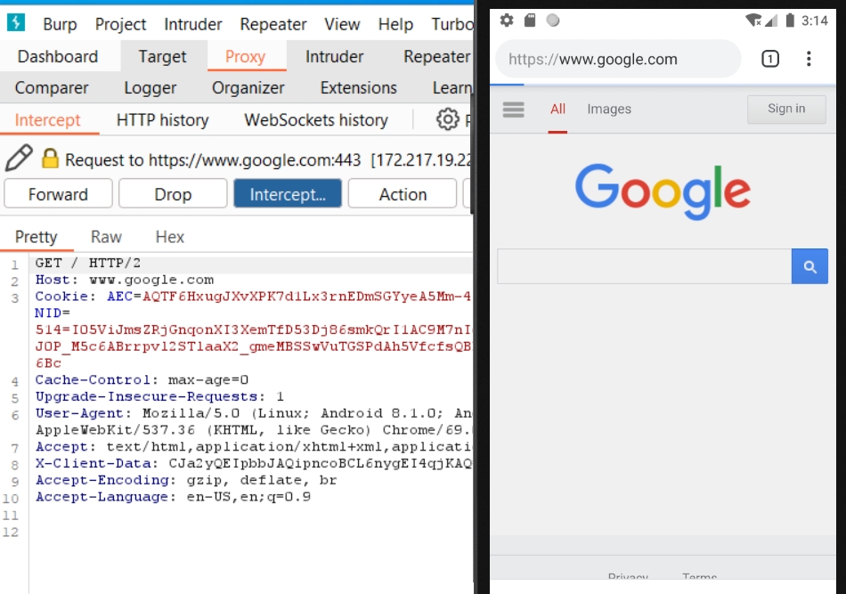 8. Open your device Browser to check whether the certificate is successfully installed and we can intercept the HTTPS traffic, Turn on the Burp Intercept, and from the device browser search for google.com.