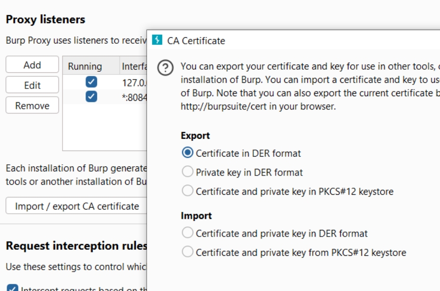 6. Now from Burp Suite, go to the Proxy > Proxy Settings and click on the Import / Export CA Certificate button under Proxy Listeners. Under Export select the Certificate in DER format and click on Next, save the certificate with the .cer extension.