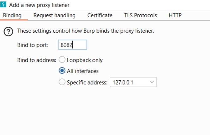 Open Burp Suite, and from the Proxy Settings tab, click on the Add button under the Proxy Listeners, enter any port, and select All interfaces.